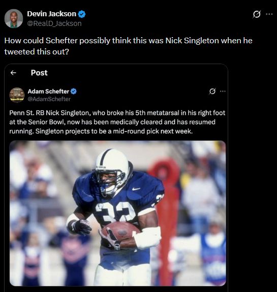 Devin Jackson of the Philadelphia Inquirer summed up the confusion: “How could Schefter possibly think this was Nick Singleton when he tweeted this out?”