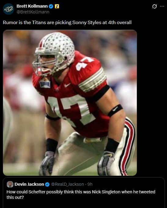 Creator of All 32, Brett Kollmann, joined the joke and wrote: “Rumor is the Titans are picking Sonny Styles at 4th overall.”