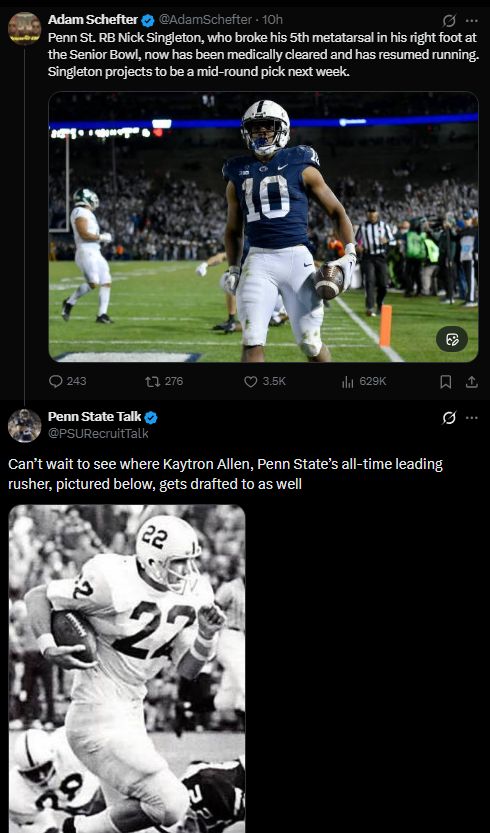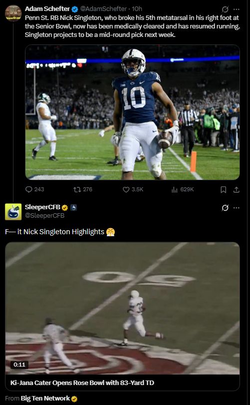 Schefter captioned the Mitchell photo: “Penn St. RB Nick Singleton, who broke his 5th metatarsal in his right foot at the Senior Bowl, has now been medically cleared and has resumed running. Singleton projects to be a mid-round pick next week.”