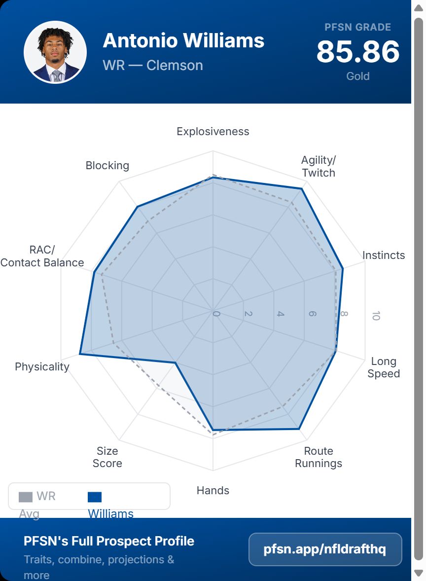 “Antonio Williams is the ideal WR prospect for evaluators who marry film and analytical indicators,” Cummings wrote. “He was an immediate breakout as a true freshman, accounting for almost 20% of his team’s receiving output. In 2024, he accounted for over 23% of Clemson’s receiving volume, and nearly one-third of the team’s total passing touchdowns. And in 2025, he remained productive amidst a stark downturn for the Tigers’ offensive efficiency as a whole.”