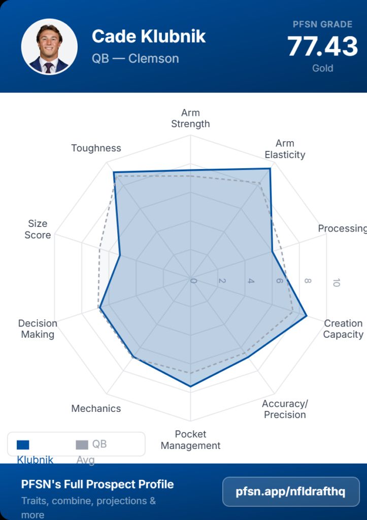 PFSN’s lead NFL draft draft analyst Ian Cummings pegs Klubnik as a likely Day 3 selection with the talent to outperform the projection under the right circumstances.