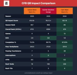 Even more impressive is their fifth-ranked passing success rate and 21st-ranked passing EPA led by Carson Beck. I’ll admit, I wasn’t the biggest Carson Beck fan when he was a Bulldog. But he has done everything in his power to prove that he is more than capable of leading a top team. For comparison, PFSN’s QB Impact scores dashboard is used to evaluate him alongside Miami’s quarterback from last season and Georgia’s current quarterback.
