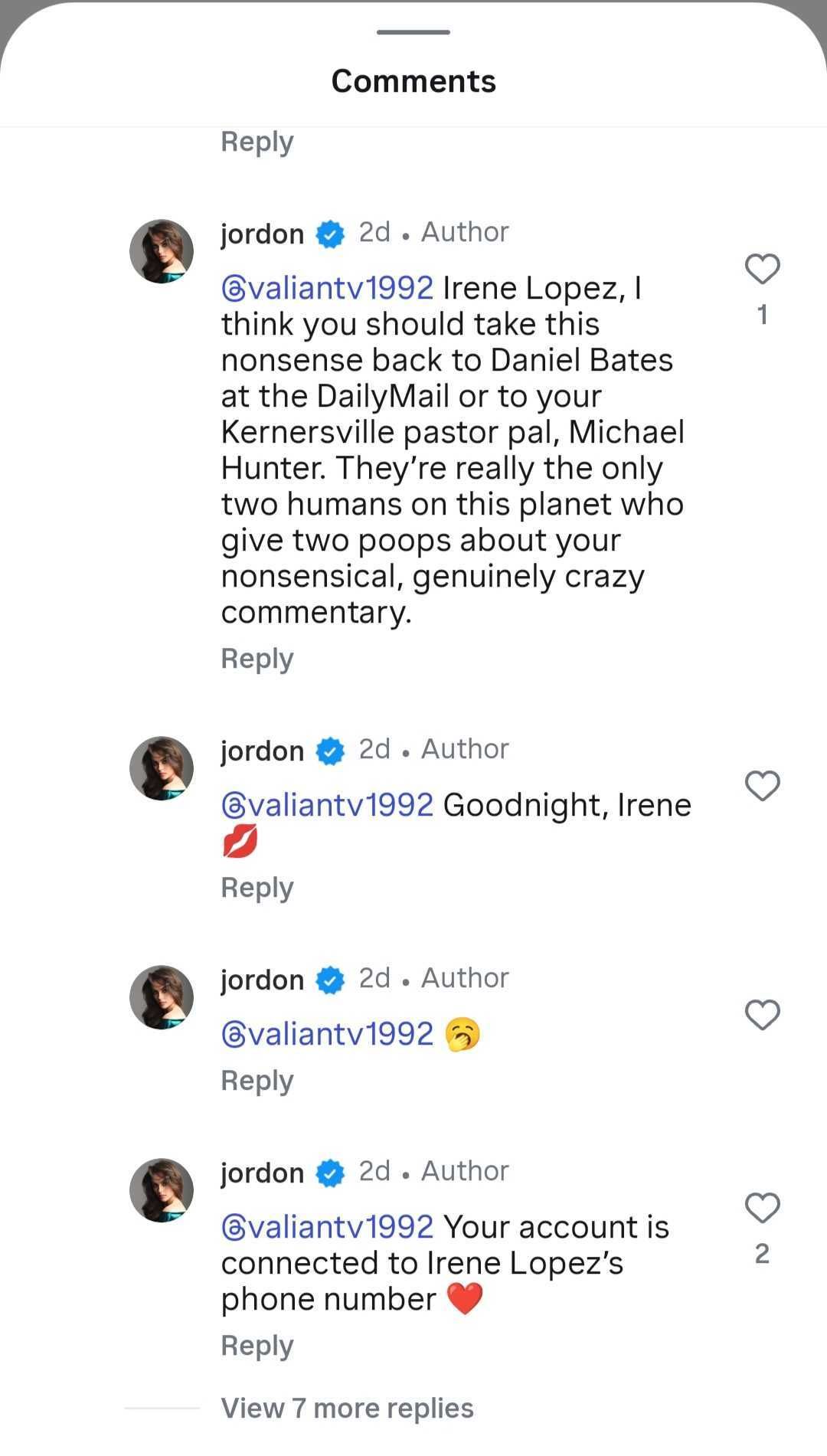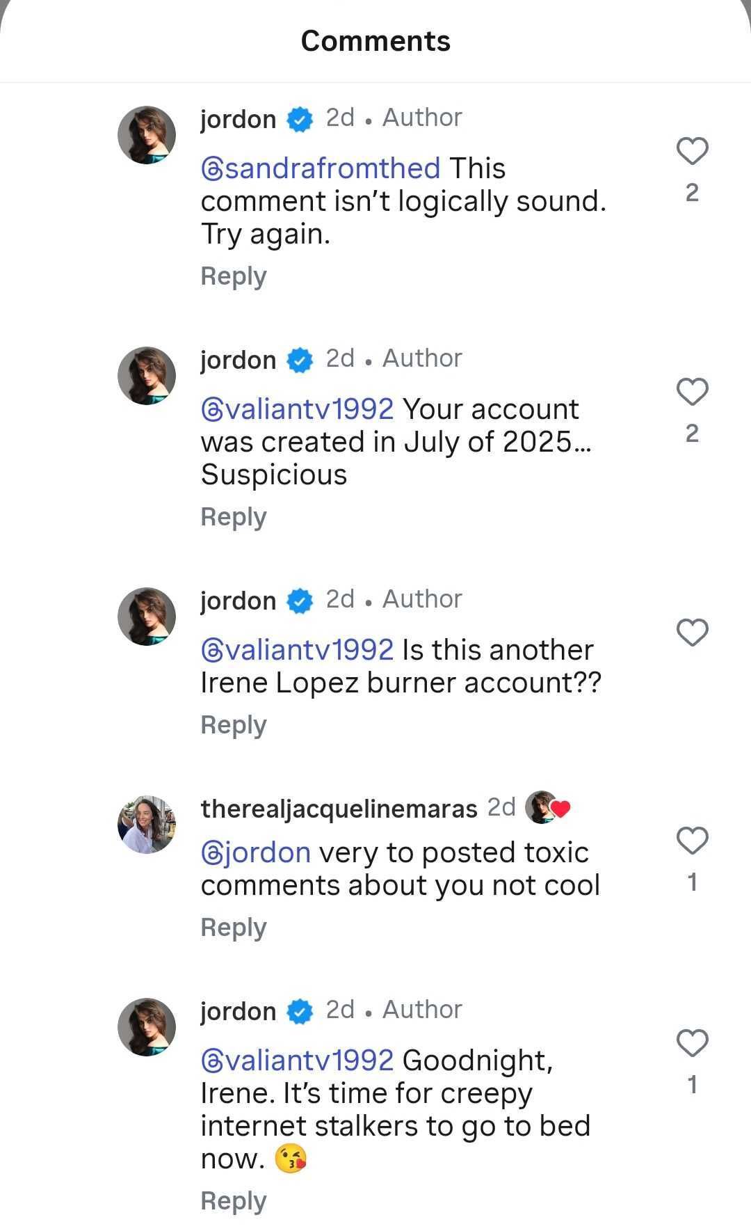 What started as a typical Instagram exchange quickly turned into a digital takedown. Hudson accused a user with the handle @valiantv1992 of being connected to a persistent online harasser named Irene Lopez. She claims Lopez has been behind multiple burner accounts and harassment campaigns targeting her posts.