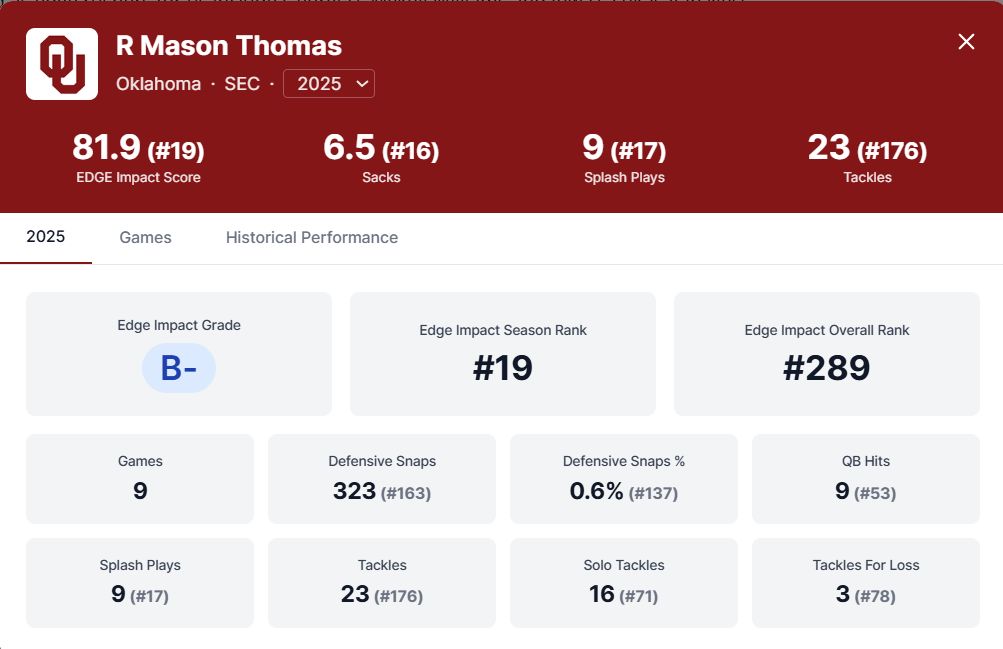Digging into the numbers, Thomas has been Oklahoma’s most disruptive defender and an engine for the Sooners’ success on that side of the ball. He leads the team with 6.5 sacks and stands second with 9.5 tackles for loss. He currently ranks 19th overall in PFSN’s CFB EDGE Impact metric, with an impressive 81.9 score on the season.