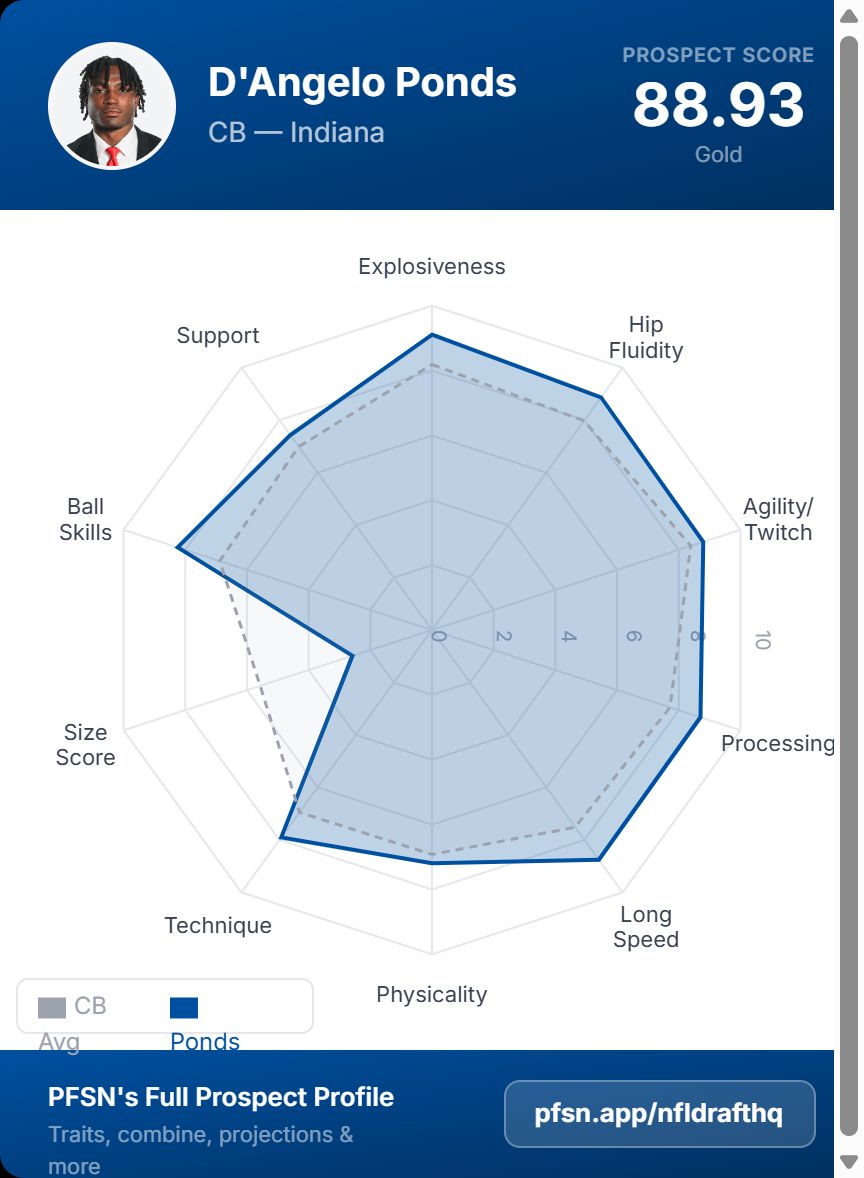D’Angelo Ponds measured 5-foot-8⅝ and 182 pounds with 29⅜-inch arms at the 2026 NFL Combine. Then he jumped 43.5 inches in the vertical. Then he ran 4.31 at Indiana’s Pro Day, before helping them win a national championship. PFSN’s Ian Cummings has him graded as the 12th overall prospect in the 2026 NFL Draft. The rest of the industry has him in Round 2. Size is doing something different here than it usually does.