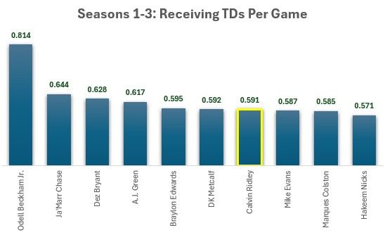 That’s a list of the top touchdown makers since 2000 during their first three NFL seasons (minimum 40 games played) and puts Ridley on a pretty impressive list in addition to being a nice trip down memory lane.