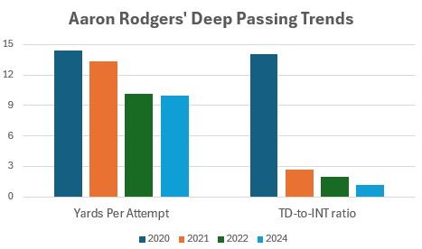 In those 17 games, 40.8% of his scoring has been down via the deep pass, and that just so happens to be the area where Father Time is taking a pound of flesh when it comes to Rodgers.