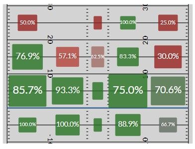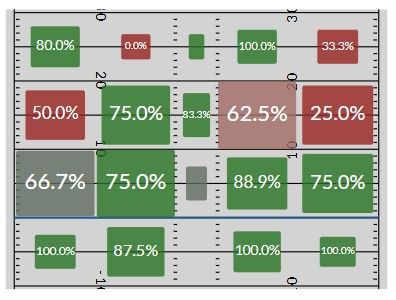 Here’s a look at his target bucket from last year compared to the two active greats mentioned above (the percentage is the catch rate on such targets, and the size of the box reflects the volume of looks in each specified area.