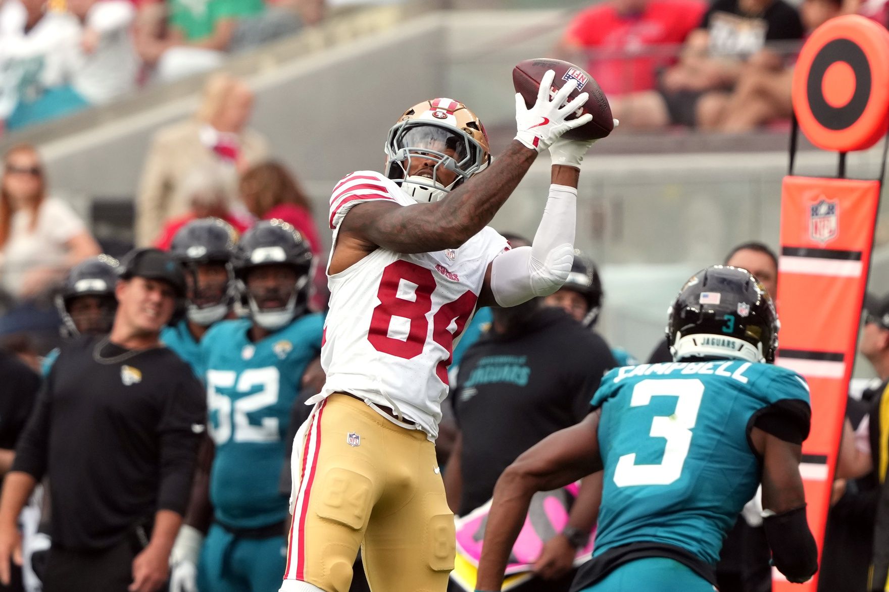 Jennings has firmly re-established himself as San Francisco’s top wide receiver after a steady uptick in usage over the past two weeks. Jennings played 85% of the snaps in Week 7 and ran a route on 89% of Mac Jones’ dropbacks, both notable increases from the week before. With that volume climb came a rise in opportunity, as his target count jumped from three to seven.​