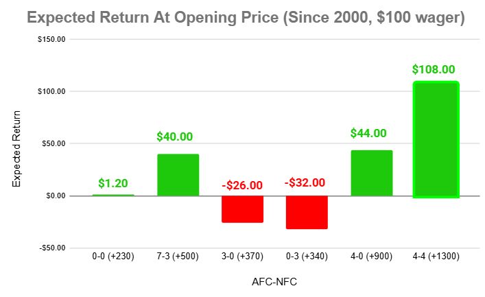As you can see, the 0-0 square is priced as the favorite and hits more often than any other box on the board, but it is also the most breakeven-priced option among the “best” squares.