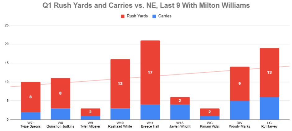 As for the big play? Just one of his 388 carries since the beginning of last season has gone for 35 or more yards. The Patriots have committed to Stevenson not for the explosive nature of his carries, but for his ability to fall forward.