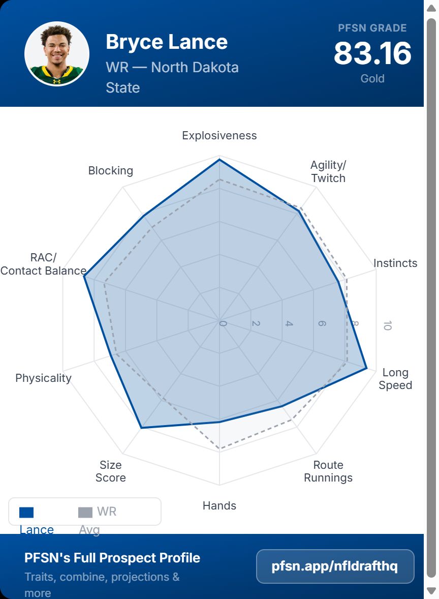 The evaluation community has paid attention. PFSN lead draft analyst Ian Cummings called Lance “one of the most compelling FCS prospects in the 2026 NFL Draft” in his pre-draft report, and the advanced numbers back it up.