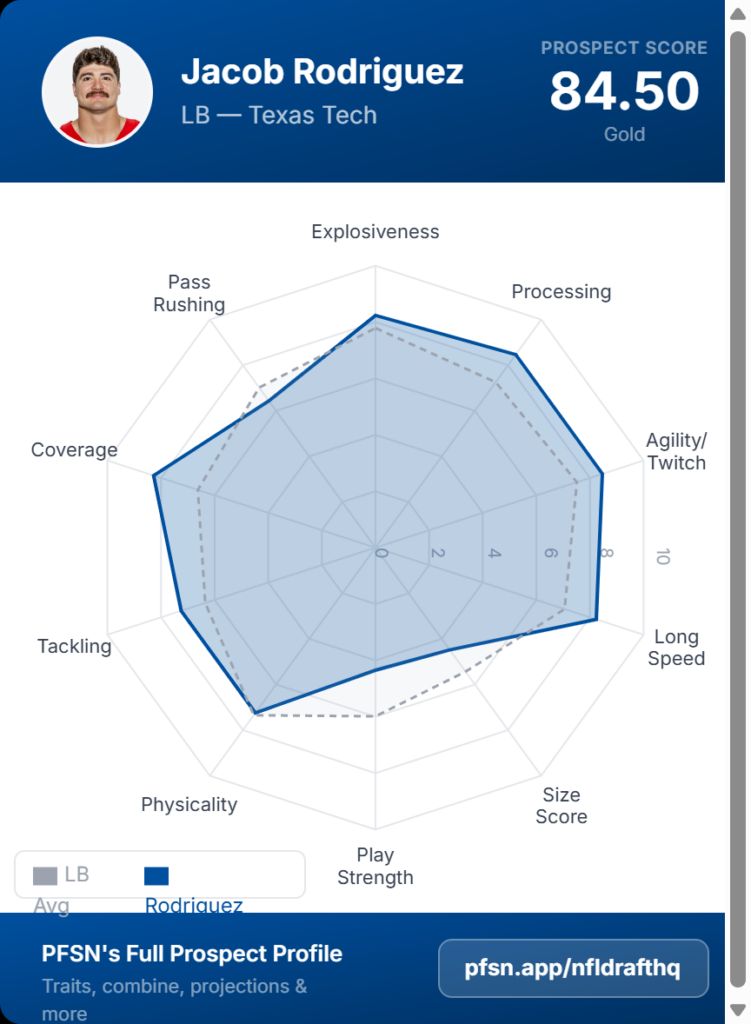 Cummings’ evaluation of the coverage profile is specific. “He’s sticky overtop sit routes, swings, and in-breakers, he’s fast-flowing and relentless on the chase in the run game, and his untethered energy permeates to his teammates,” Cummings wrote. “Best fitting behind a strong defensive line that keeps him clean, Rodriguez has impact starter upside.”