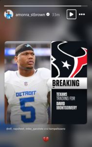 On his Instagram story, St. Brown posted a screenshot of Montgomery being traded to the Texans and added a heartbreak emoji.