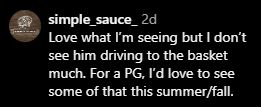 One fan offered constructive analysis, saying, “Love what I’m seeing but I don’t see him driving to the basket much. For a PG, I’d love to see some of that this summer/fall.”