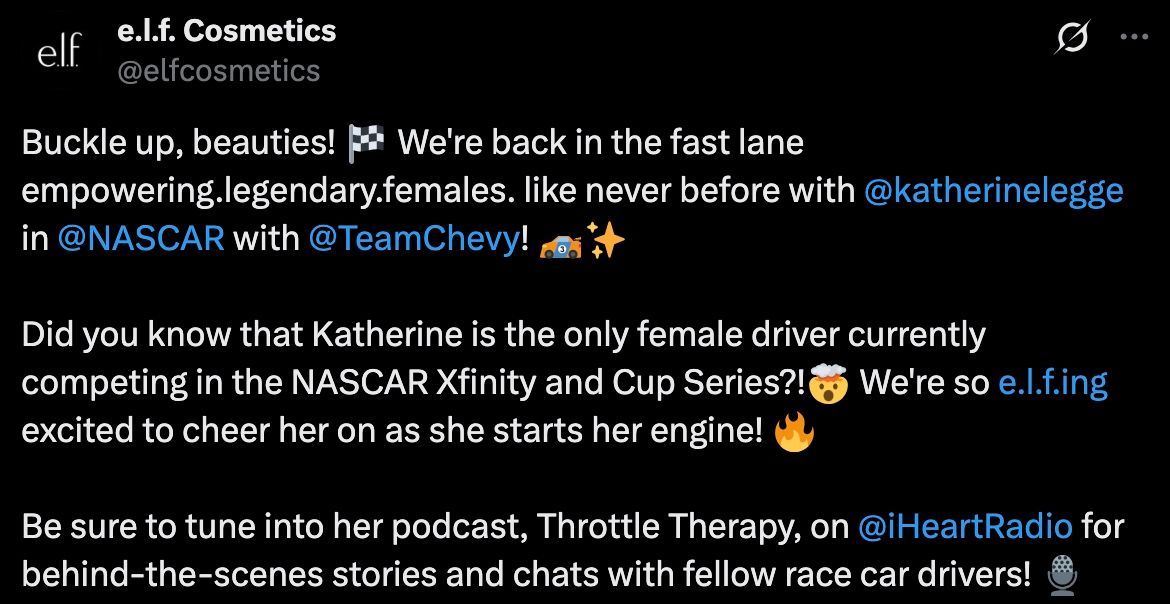 “Female NASCAR fans are more likely to watch sports on TV, listen on the radio, and attend a live event than female fans of other sports. That’s our signal to lean the e.l.f. in with zero distance between us and the community.”