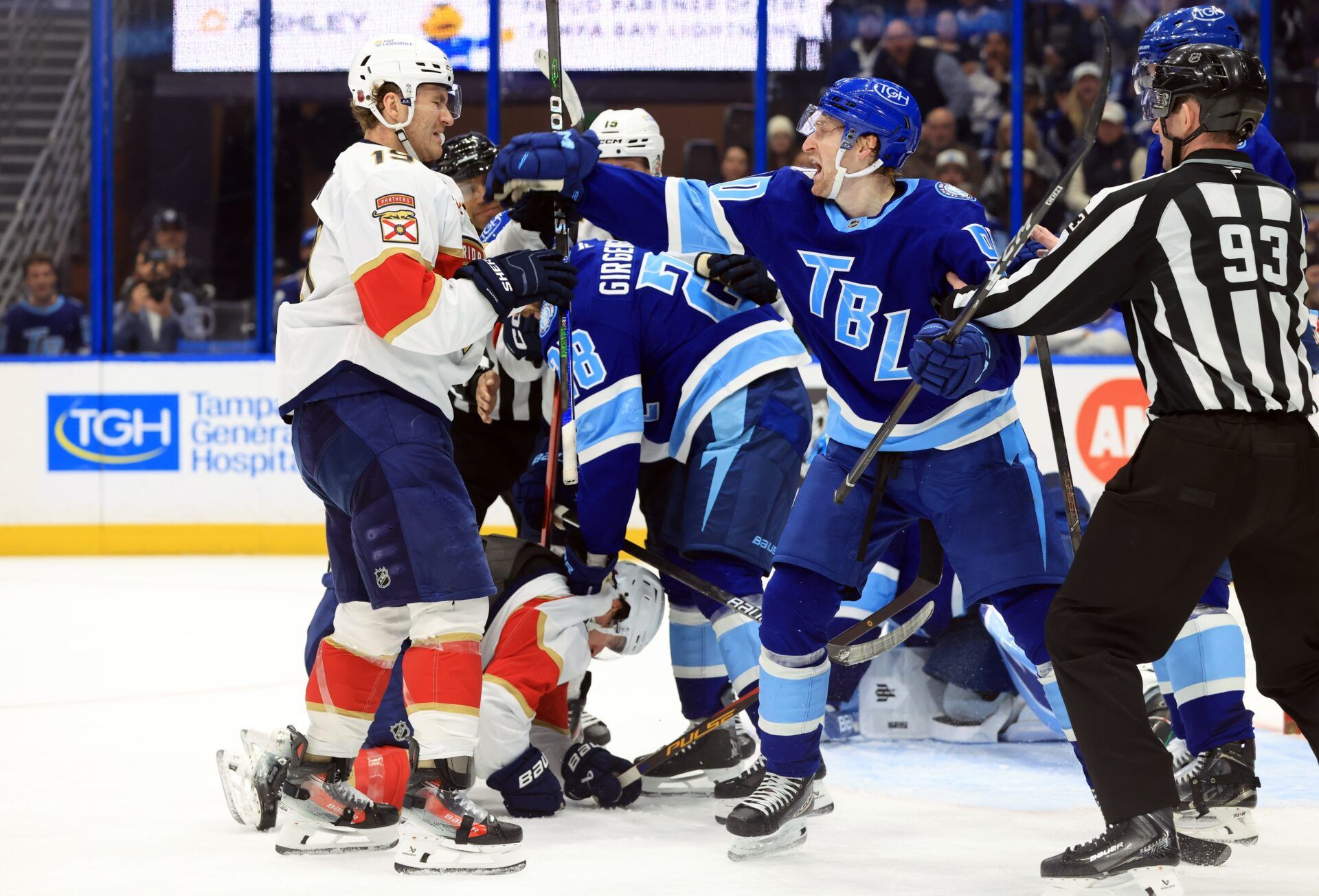 The chaos didn’t stop there. Gustav Forsling kept throwing punches at J.J. Moser as he went down. Donovan Sebrango and Darren Raddysh tangled in a separate altercation nearby. As Hagel made his way to the penalty box, he turned toward the Tampa Bay crowd and pumped them up for more noise.