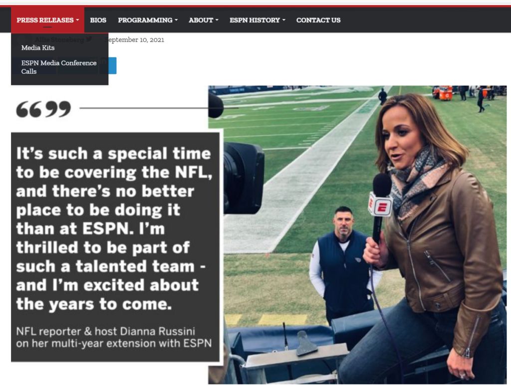Back in 2021, Russini signed a multi-year extension with ESPN in what would have been her fifth season covering the NFL with the company. Russini was an NFL insider at the time, breaking news and covering games.