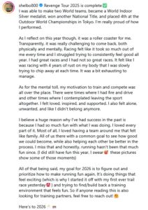 Calling the 2025 season her “revenge tour” in an Instagram post, Houlihan described her return to elite competition after several years away as physically draining, saying it felt like racing with “four years of rust” on her body.