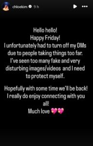 “Hello hello! Happy Friday! I unfortunately had to turn off my DMs due to people taking things too far. I’ve seen too many fake and very disturbing images/videos and I need to protect myself. Hopefully with some time we’ll be back! I really do enjoy connecting with you all ! Much love.”