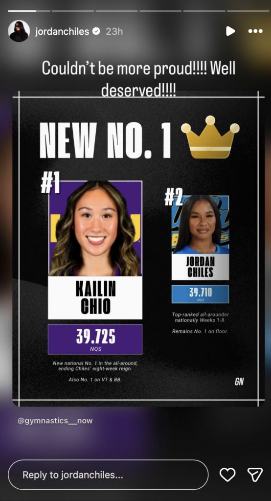 However, in a sign of true sportsmanship, Chiles, who represents the UCLA Bruins, shared the rankings on her Instagram story and congratulated Chio for her achievement, as she wrote in the caption,