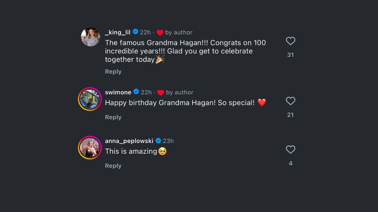 Many of Ledecky’s USA Swimming teammates commented on the post, including Lily King, who wrote: “The famous Grandma Hagan!!! Congrats on 100 incredible years!!! Glad you get to celebrate together today🎉”
