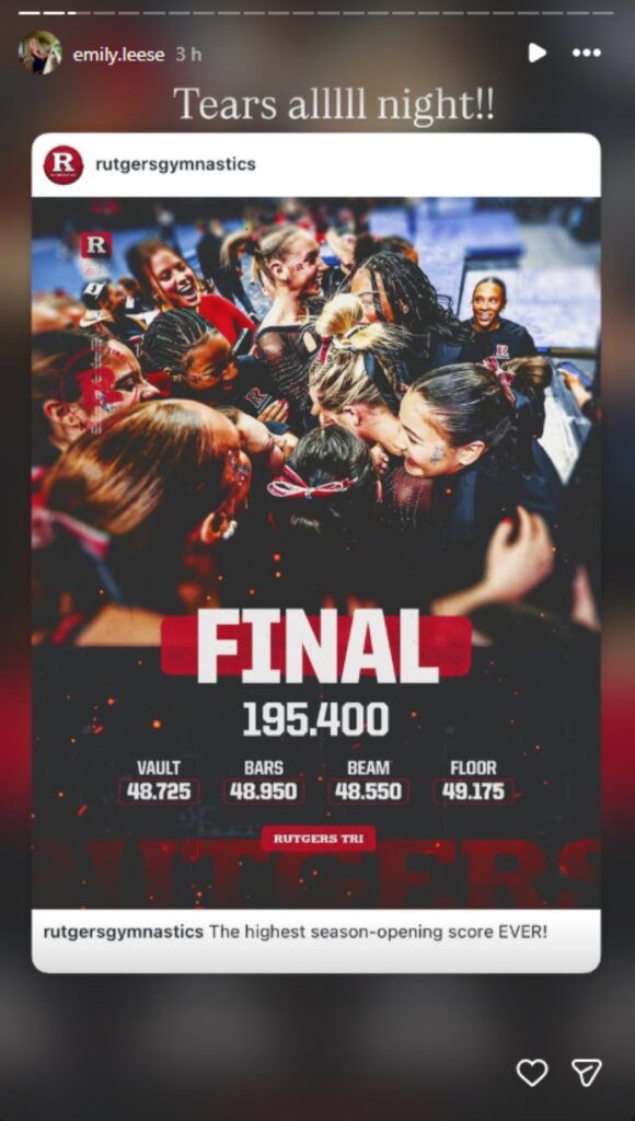 Rutgers Gymnastics standout Angel Leese made her comeback after missing the entire 2025 season, only to post the highest vault score of the night and break down in tears. She stuck a perfect landing, scoring a 9.9 in her first routine back.