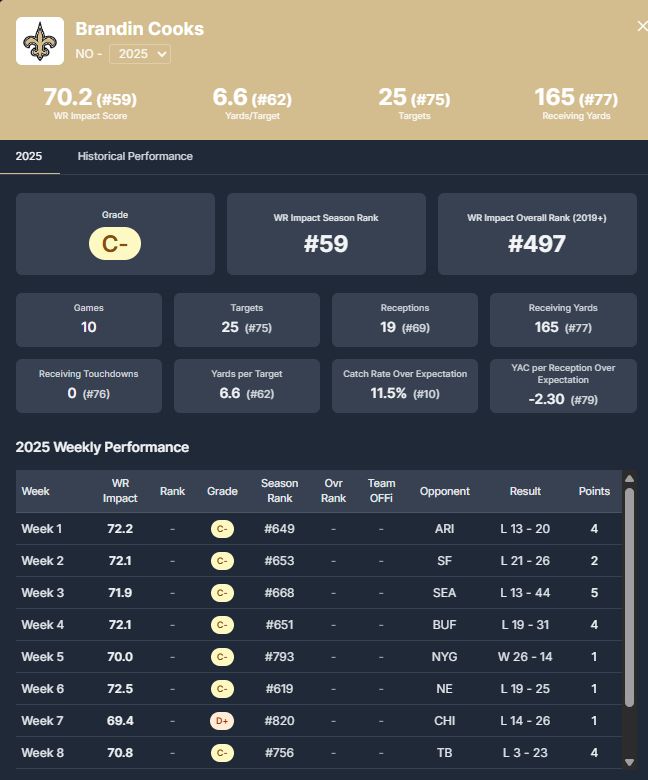 While being a free agent at this point might not have been the plan for Cooks at this point of the year, he has been more than good enough for another team to take a shot on. He ranks as the 59th-best wide receiver in the NFL, per PFSN Wide Receiver Impact, with a C- grade.