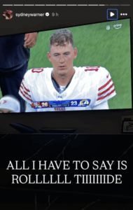 Sydney Warner shared her reaction to Mac Jones’ performance on her Instagram story shortly after the 49ers’ 26-23 overtime win. The story featured an image of Jones on the sideline with text reading “ALL I HAVE TO SAY IS ROLLLLLL TIIIIIDE.”
