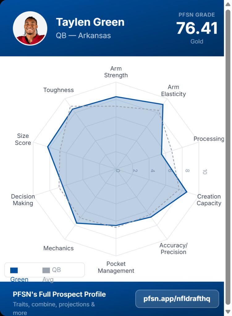 PFSN lead draft analyst Ian Cummings captured the gap. “Taylen Green has a truly elite physical skill set, with explosive athleticism and easy arm talent and velocity generation,” Cummings wrote, “but the operational part of his game is too underdeveloped, even after almost four years of starting experience. He likely goes off the board on Day 3.”