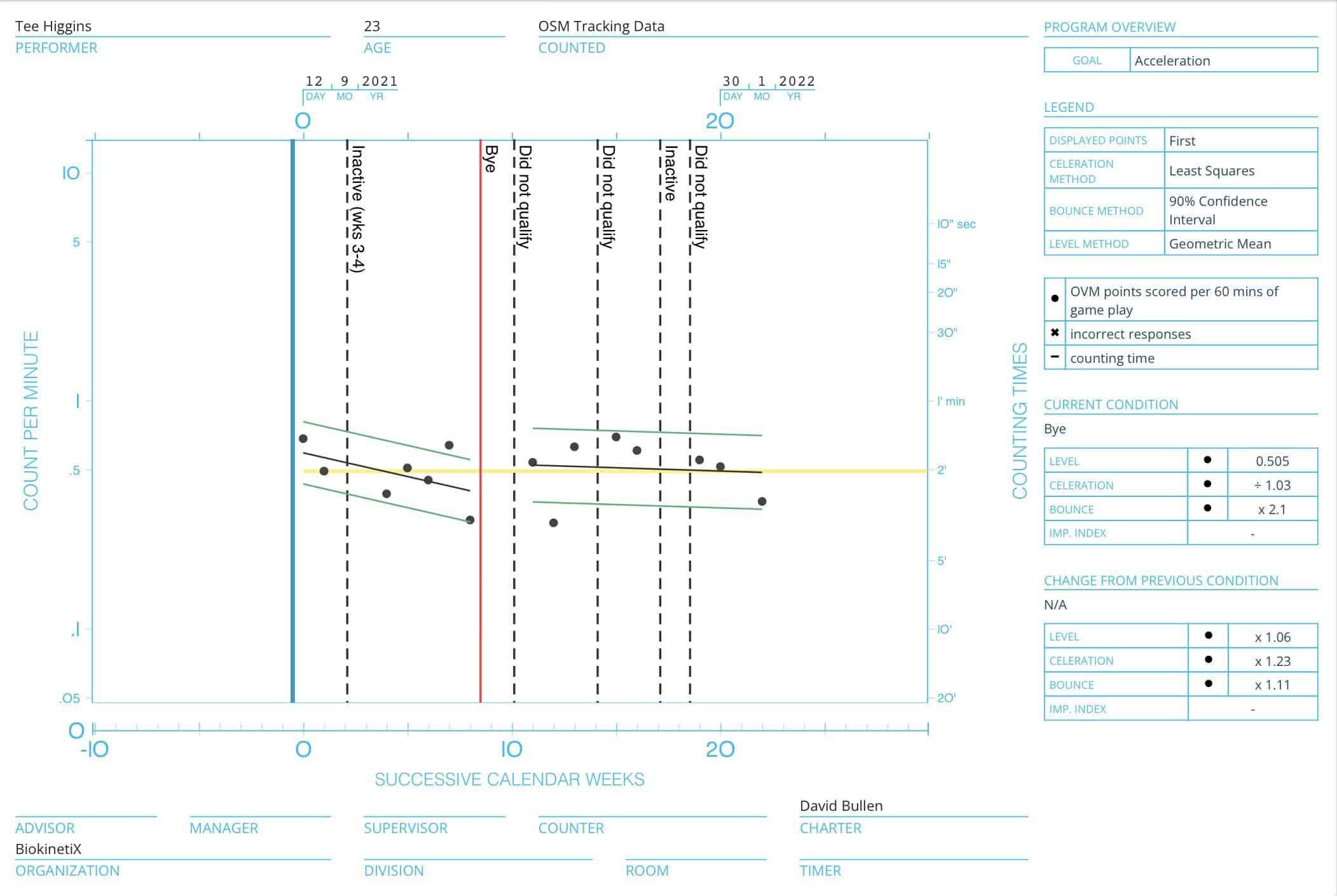 To get a better sense of how Higgins’ performance in Super Bowl LVI compared to his yearly performance, let’s look at his weekly grades.