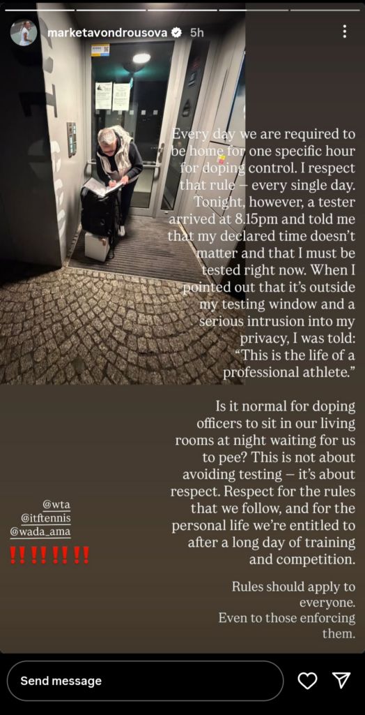 Vondroušová shared a post on Instagram last week, describing the incident from her perspective. She revealed how a visit from a doping control official caused her to have an “acute stress reaction and anxiety disorder.” She added that the individual rang her doorbell late at night and would not identify themselves, which made her feel unsafe.