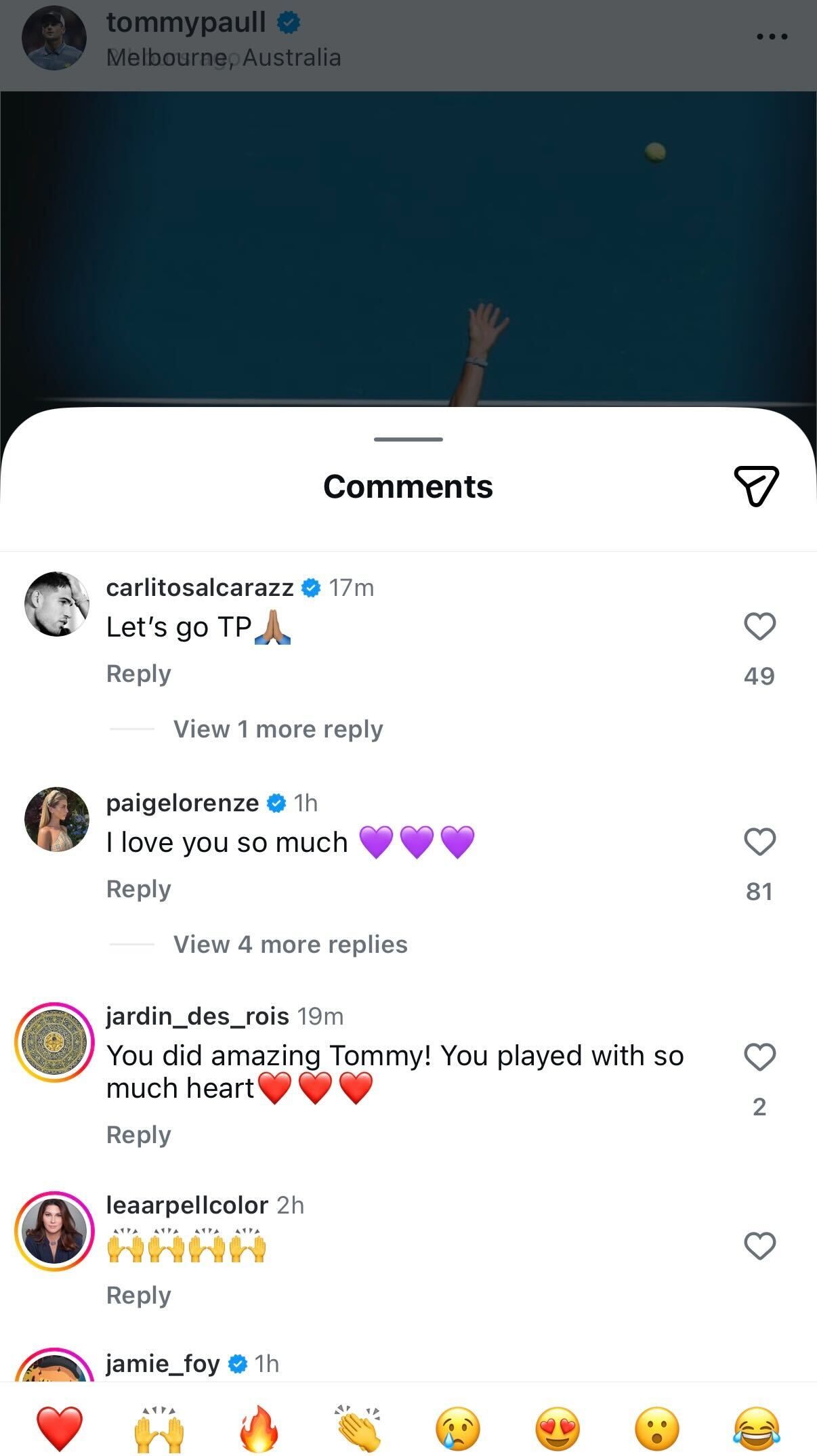 After the match, Paul posted some pictures from the match on Instagram with the caption, “Till next year 🦘.” The post received some cheers from his opponent and people close to him. Alcaraz commented, “Let’s go TP🙏🏽,” while his fiancée and soon-to-be wife, Lorenze, commented, “I love you so much 💜💜💜.”