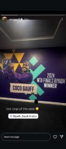 Coco Gauff will be eager to continue her five-match winning streak at the WTA Finals in Riyadh, where she won the 2024 title in hard-fought fashion against Zheng Qinwen in a three-set championship match. On Monday, the 21-year-old posted an Instagram story featuring a photo of her name and her picture from last year’s trophy ceremony on the champions’ wall at the King Saud University Indoor Arena.