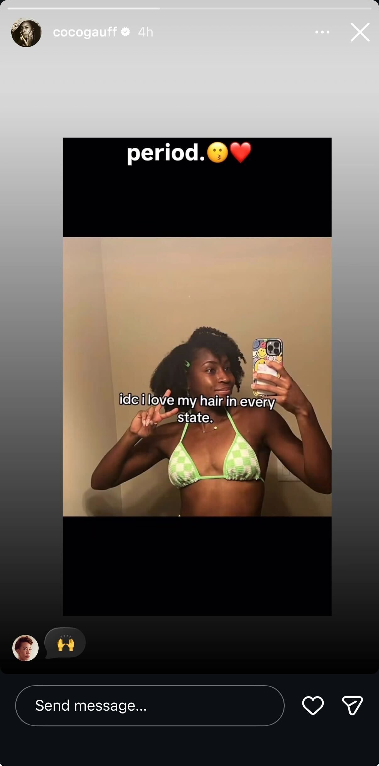 On her latest Instagram Story, the 22-year-old dismissed the noise about her hair entirely, posting a photo with a caption: “idc i love my hair in every state. Period.”