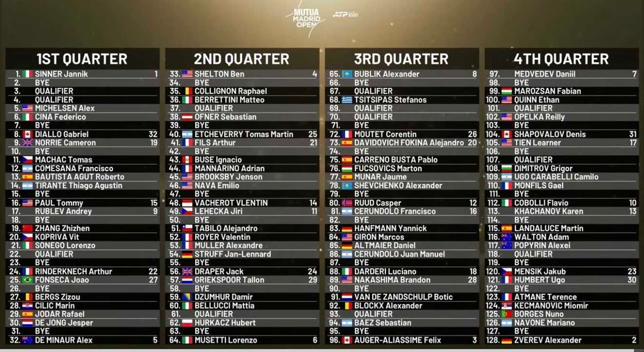 Sinner will receive a first-round bye and will begin his Madrid Open campaign against one of two qualifiers who will compete in the first round. The Italian could then face 32nd seed Gabriel Diallo in the third round.