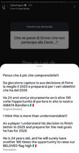 Fabio Fognini, who retired this year, also spoke up, saying Sinner’s decision should be respected and that he will get enough opportunities to play for the nation. During a Q&A session on Instagram, Fognini wrote (translated from Italian),