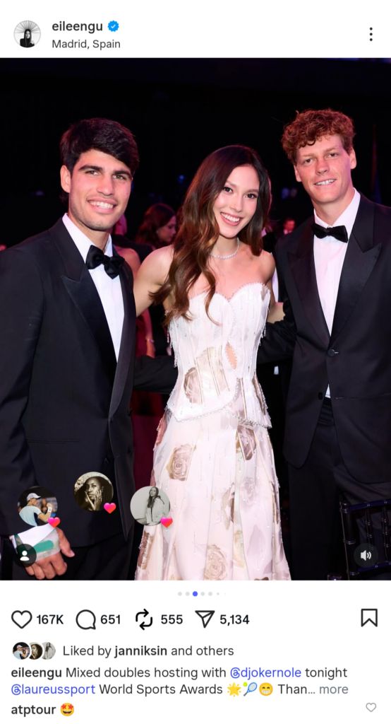After the event, Gu posted a picture of herself with Sinner and Alcaraz on Instagram.