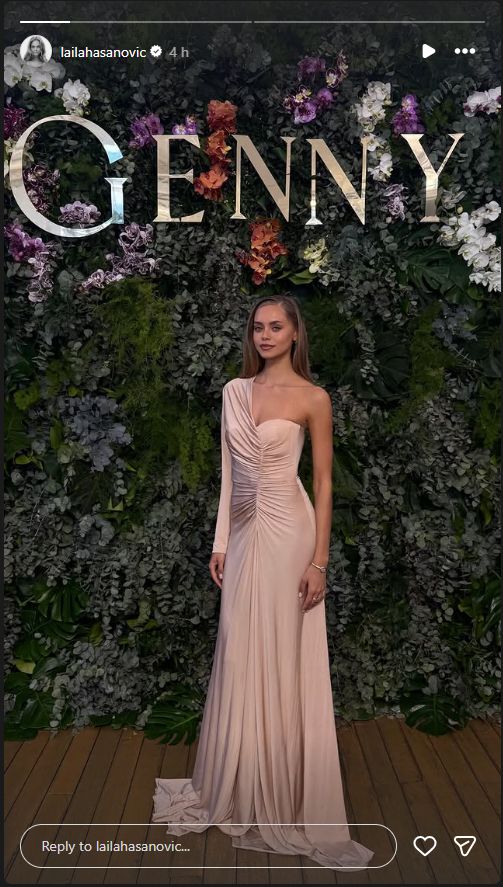 Genny is an Italian brand that provides women’s ready-to-wear, leather goods, shoes, perfumes, accessories, and jewelry. Hasanovic, who has worked with brands including The Garment, OpéraSPORT, and Armani Beauty, wore a flowing, one-shoulder peach-colored gown with minimal jewelry. In her Instagram story, she shared a glimpse of her outfit against the brand’s floral backdrop.