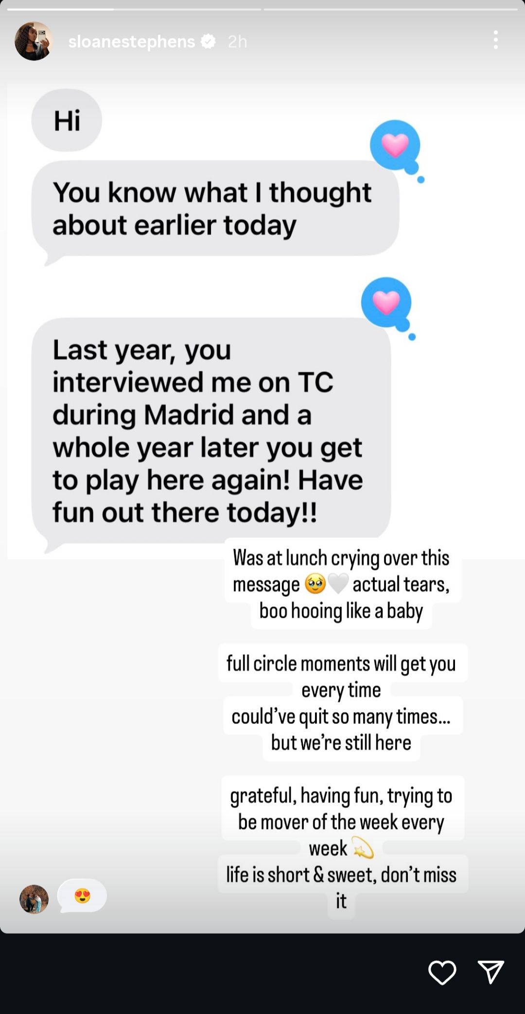 While eating lunch before her opening match this week, Stephens received a text from a friend. The message said: “Last year, you interviewed me on [Tennis Channel] during Madrid and a whole year later you get to play here again! Have fun out there today!!”