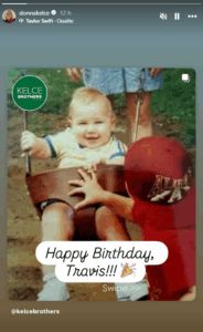 Donna celebrated her son’s 36th birthday by reposting a sweet throwback photo from a fan page tribute on her Instagram Stories. The image shows a baby Travis being pushed in a swing on a playground, seemingly by his older brother, Jason Kelce. Over the photo, Donna, 72, wrote a simple but heartfelt: