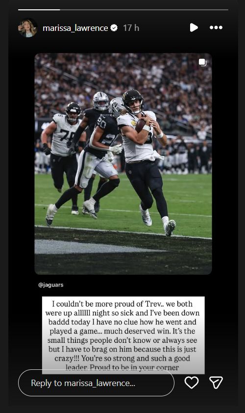 Following the game, Marissa Lawrence posted on Instagram to praise her husband’s grit. Sharing a Jacksonville Jaguars post, which had a picture of him mid-game, she wrote: