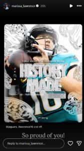 After the game, the Jaguars shared a celebratory post on Instagram highlighting the milestone. It didn’t take long for Marissa Lawrence to reshare it. Her message was short and telling. “So proud of you,” she wrote.